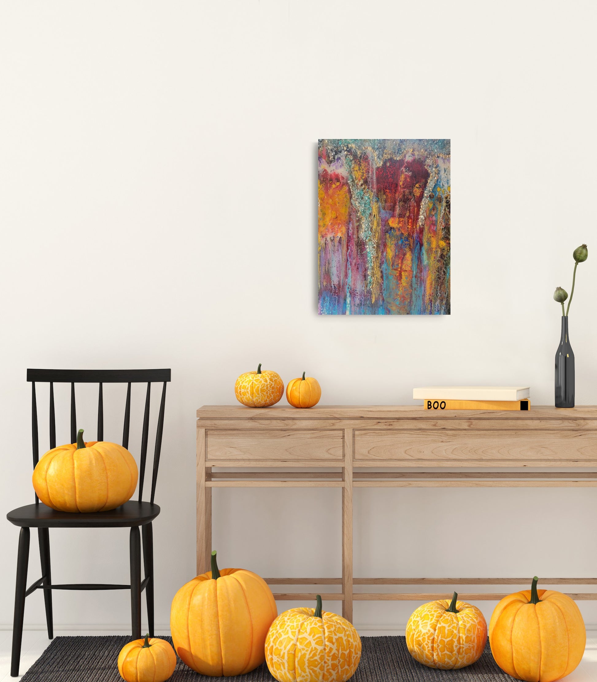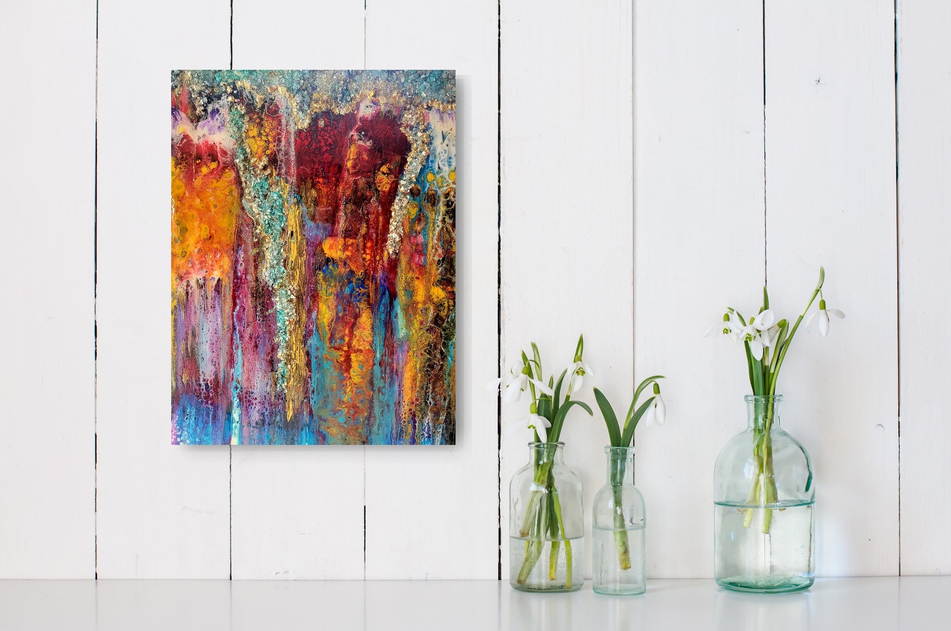 This painting is a combination of modern + abstract art +resin on a wood frame.