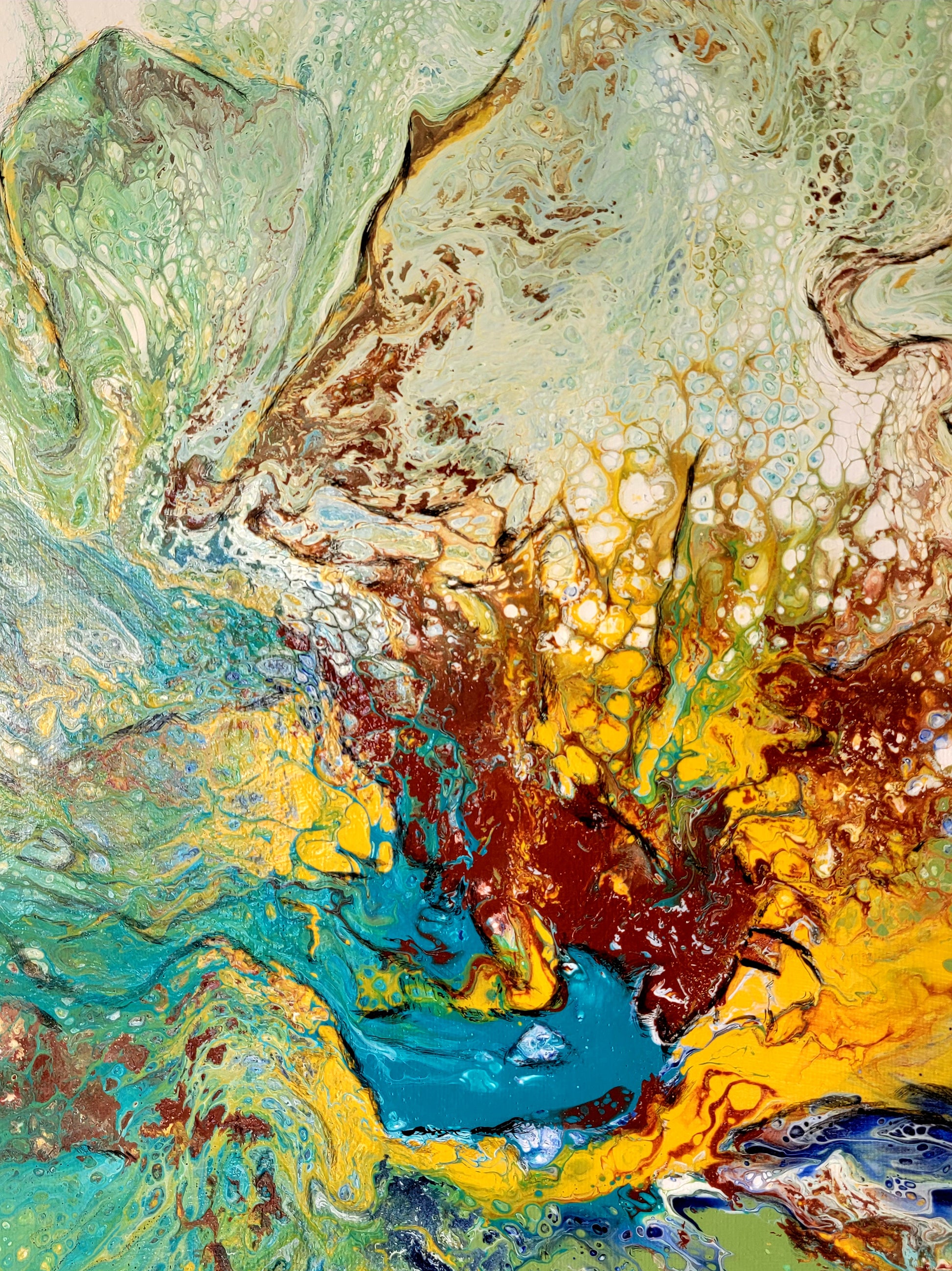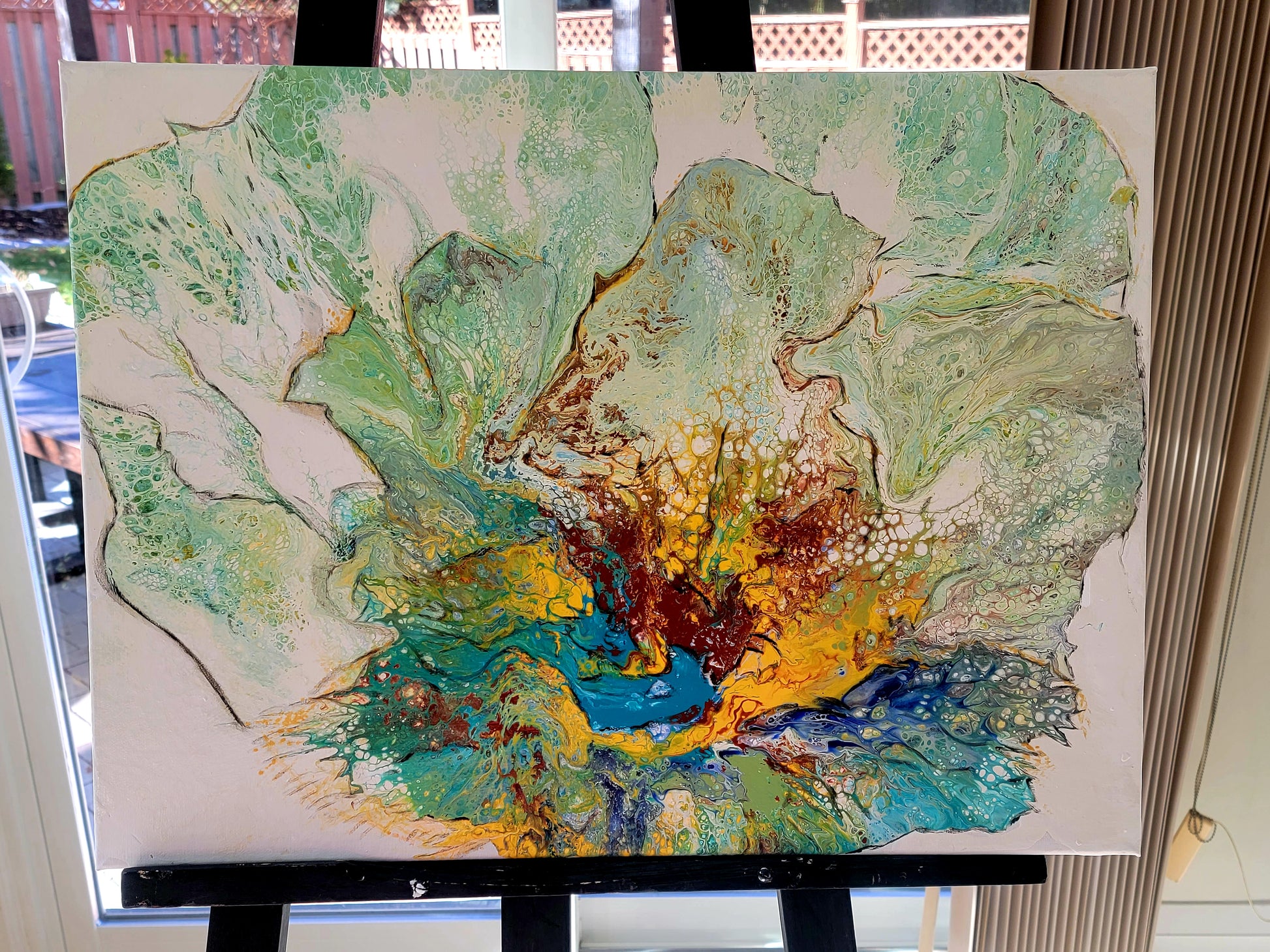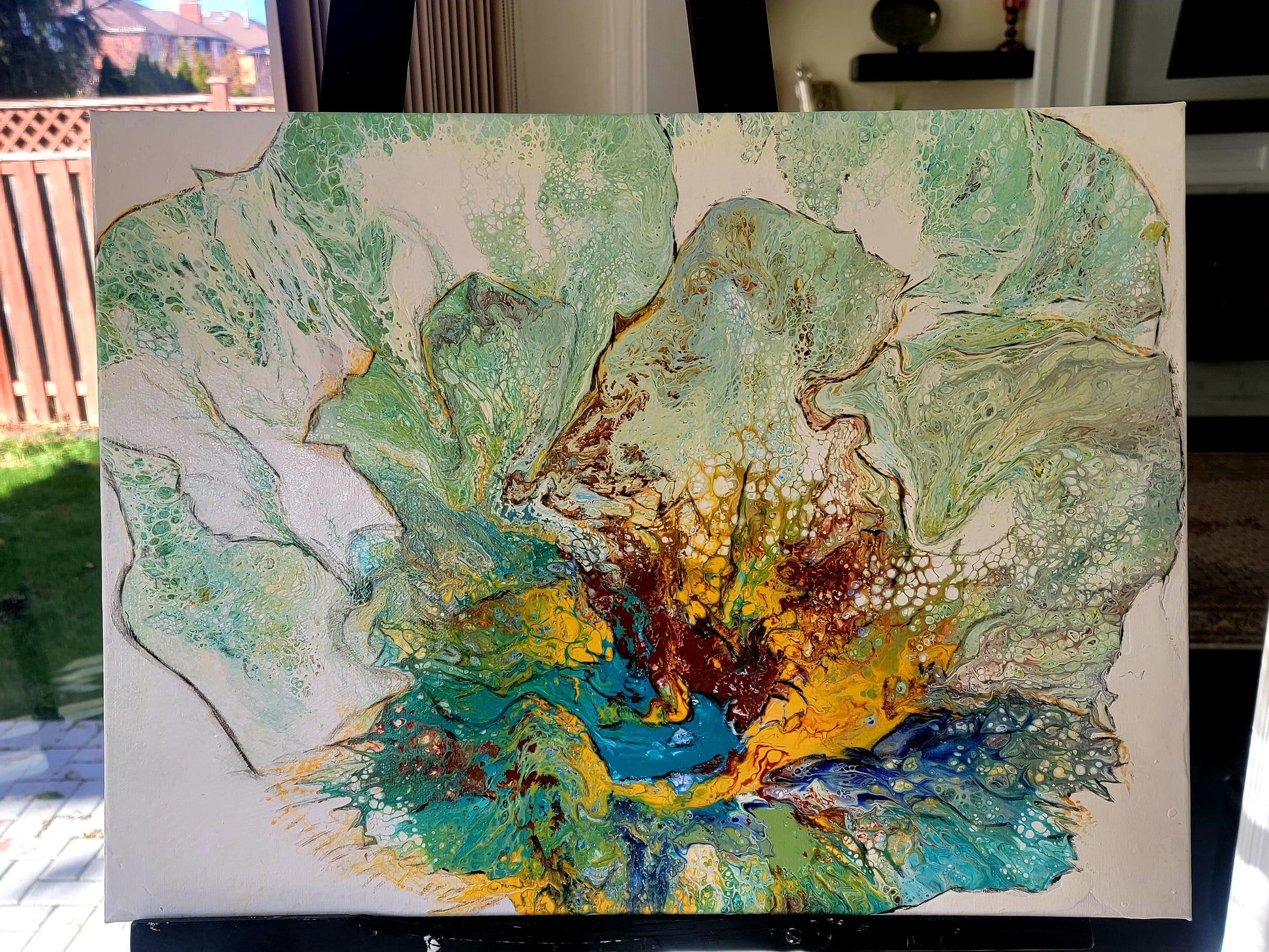 This painting is an inspiration of common flowers found in Hawaii, the greenery of the field and the outstanding flowers that symbolized the area. The concept of this form of art is merged together by using abstract and modern styles of painting using pour painting technique. This square piece of work is a perfect addition to any office or home space.