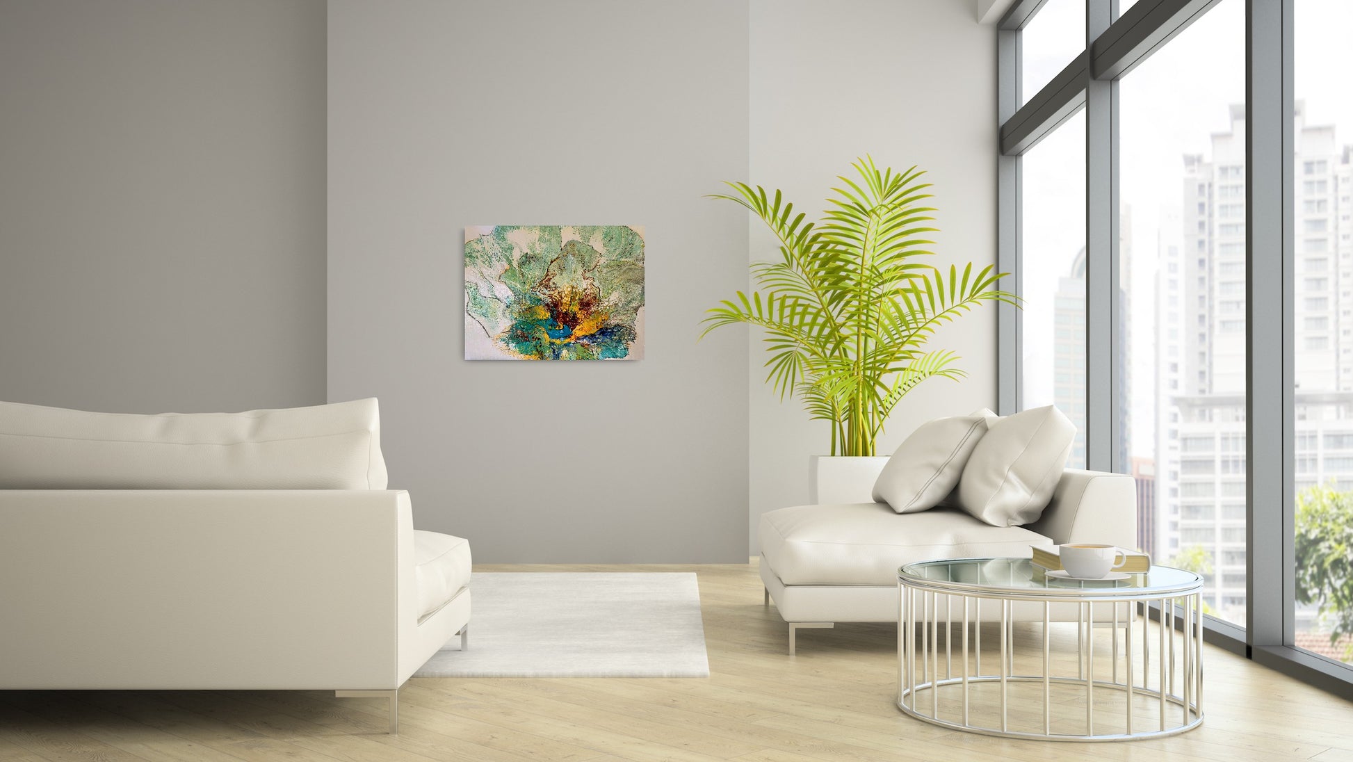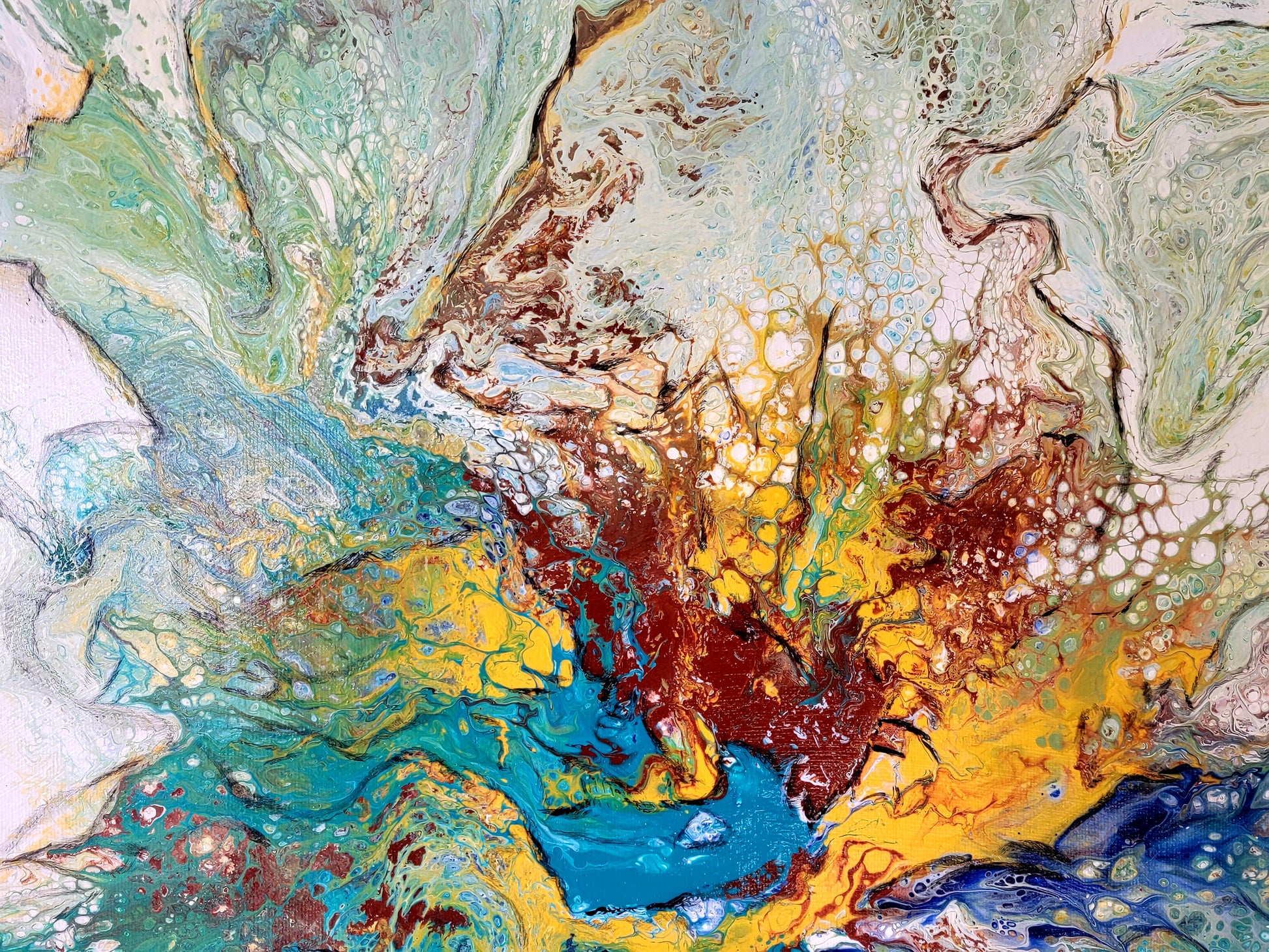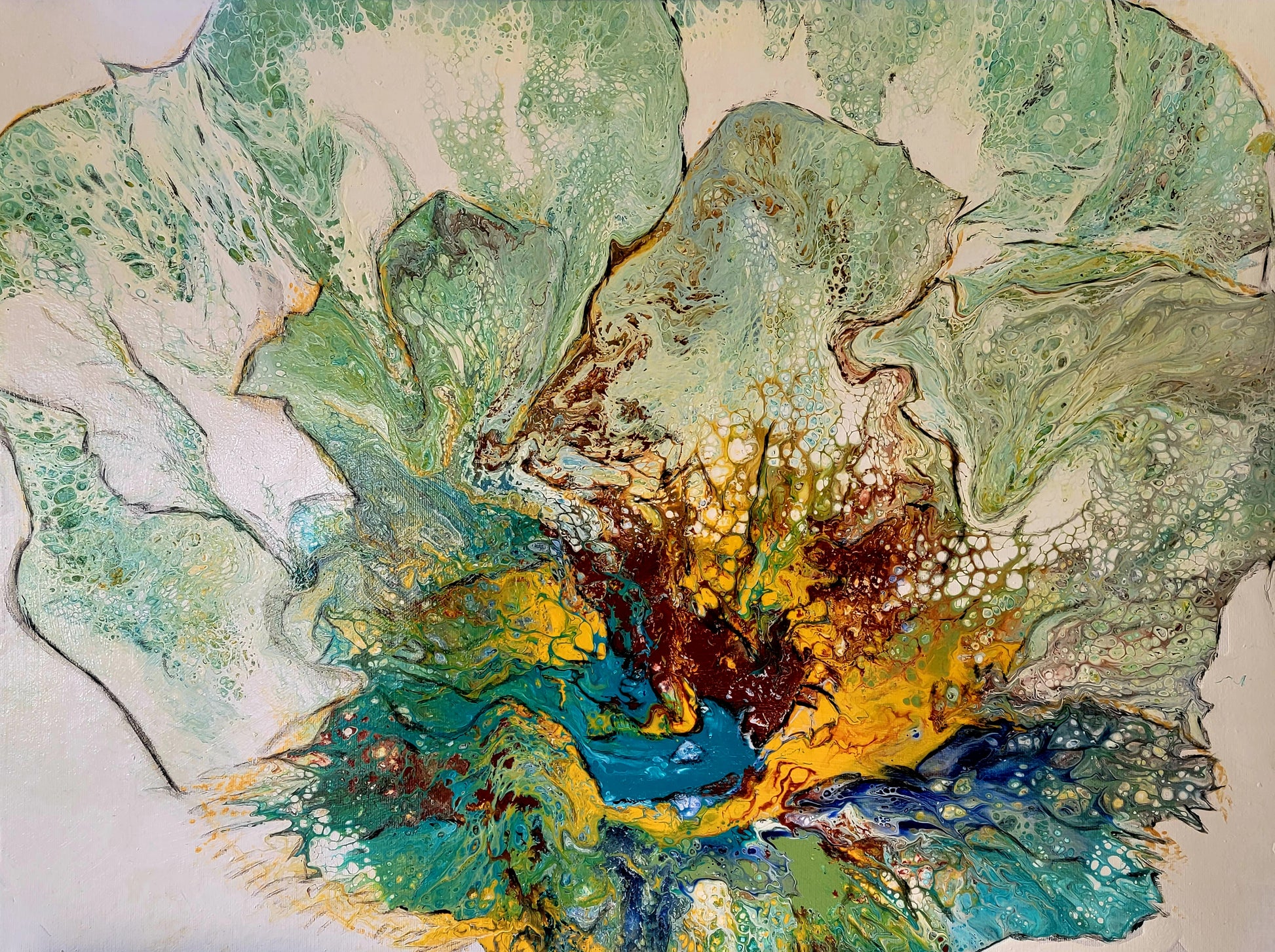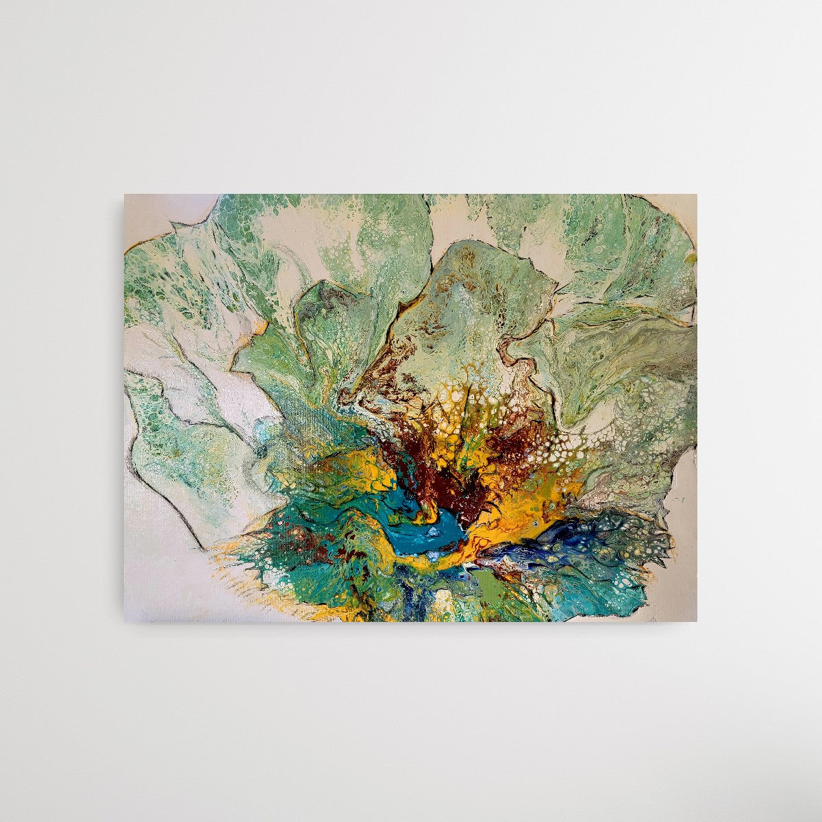 This painting is an inspiration of common flowers found in Hawaii, the greenery of the field and the outstanding flowers that symbolized the area. The concept of this form of art is merged together by using abstract and modern styles of painting using pour painting technique. This square piece of work is a perfect addition to any office or home space.